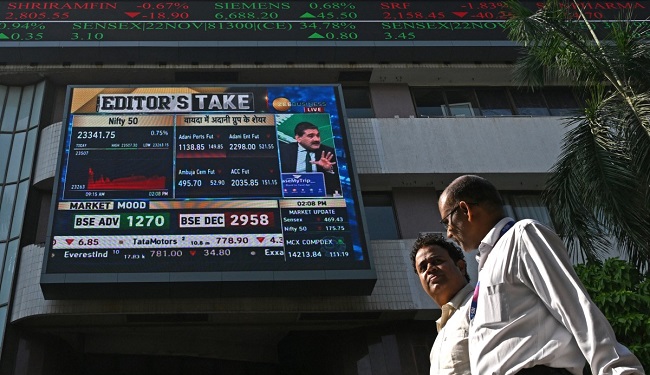 Pedestrians walk past a digital broadcast on the facade of Bombay Stock Exchange (BSE) in Mumbai on November 21, 2024. - Shares in Indian conglomerate Adani tanked on November 21 after its industrialist owner Gautam Adani was charged by US prosecutors with handing out more than $250 million in bribes for key contracts. (Photo by INDRANIL MUKHERJEE / AFP)